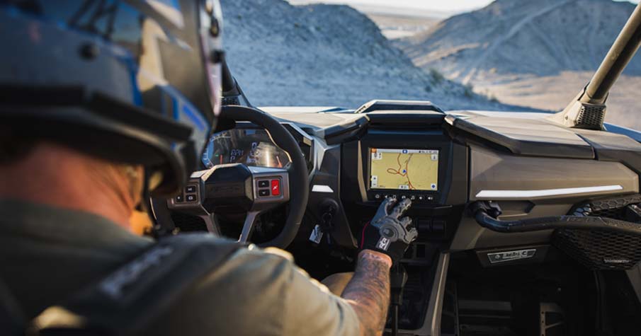 - RIDE COMMAND® 7” Glove-Touch Display: DYNAMIX 2.0 Visualizer, Built-In GPS, Group ride (cell-based or GPS based), Topographic Mapping, Bluetooth & USB Smartphone Connectivity, AM/FM & Weather Radio (Accessory Speakers Required - Sold Separately), In-Vehicle Communications Capable With Optional Sena Headsets, Polaris P.A.S.S Anti-Theft System. Dual-sweep Analog Dials w/ 4" LCD Rider Information Center: User Selectable Blue/Red Backlighting & Brightness, Programmable Service Intervals. Digital Instrumentation: Speedometer, Tachometer, Odometer, Tripmeter, Clock, Hour Meter, Gear Indicator, Fuel Gauge, Coolant Temperature, Voltmeter, Service Indicator and Codes, Seat Belt Reminder Light, Gear Indicator, DC Outlet.